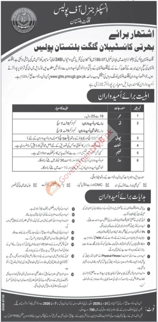 The Gilgit Baltistan Police Constable Jobs 2026 have been announced for 349 Constable (BS-07) positions for police recruitment to the Inspector General of Police, Gilgit-Baltistan, for residents who meet the eligibility criteria. This recruitment is focused on standard police constable hiring; therefore, established requirements for age, education, domicile, and physical standards will be applied (separate standards will apply for men and women). Applications must be submitted online through the GBTS website between May 31, 2026, and June 7, 2026, along with the required application processing/test fee. There is also a separate fee to be paid if you are selected for testing. In addition, a list of available positions, a summary of the eligibility criteria for each of the available positions, and instructions on how to apply can be found below. The Gilgit Baltistan Police Constable Jobs 2026